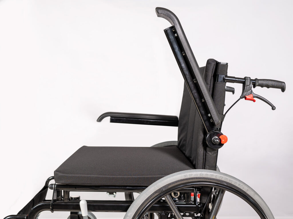 Pokud byste potřebovali upravit těžiště vozíku pro zlepšení stability, není to problém. Jednoduše přesuňte těžiště do předpřipravených otvorů jak pro hřídel kola, tak uchycení brzdy.